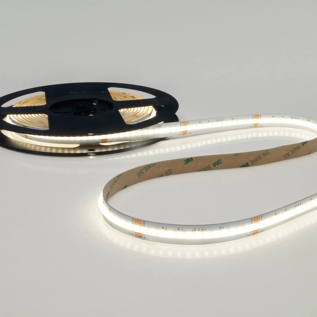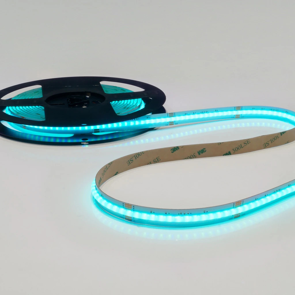 Banda LED COB RGBW rezistentă la apă oferă o lumină uniformă, fără puncte vizibile, fiind o alegere excelentă și pentru utilizarea în exterior. Permite o proiectare flexibilă a iluminatului, combinând efecte colorate cu o lumină naturală, alb cald (2700K).